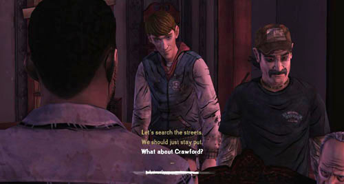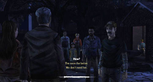 Now you can talk to Ben and Kenny (it does not matter which one you choose first). If you entrusted Clementine to Ben's care at the end of the first chapter, Lee will remind Ben of that now and will criticize him. It does not matter what you'll answer.