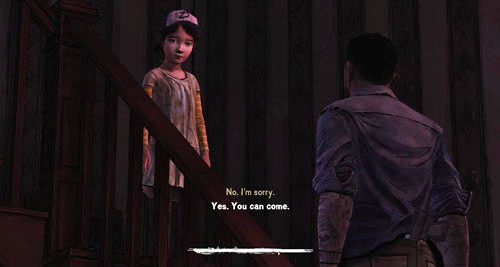 The choice will be made by selecting one of the two dialogue options below. It is worth noting that - which is quite obvious - if you do not take Clementine with you, you will miss a lot of conversations with this character.