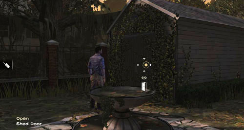 If you try to go back inside the house (Use: House Door), or walk about for a while, you'll notice that the shed door has moved. Head over there. You can also search the bushes (Look At: Shrub) and look at gate on the right (Look At: Gate). If you go left, you will be able to look at the Fence. First of all, however, look at the Shed Door and then try to open it (Open: Shed Door).
