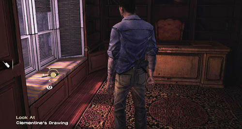 The most interesting thing in this room is Clementine's drawing by the window (Look At: Clementine's Drawing). You can look through the window (Look Through: Office Window) and search the cabinets - the one next to the window on the right and the one behind the desk (Examine: Cabinet). You can try to lie down (Use: Sofa), but Lee will refuse. There's nothing more to do in the study so leave.