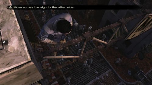 It is time for more actions - the only possibility is to cross a metal banner over the street. In fact the choice who will go first doesn't matter ("You two go first.", "I'll go first."), because the result will be the same. The banner will fall down and Lee gets separated from Omid and Christa.