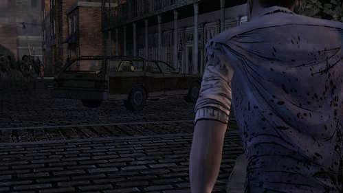 Lee decides to get to the hotel, by literally cutting his way through hordes of zombies. If he still has an arm, he will pick up the glass shard from the street and take the cleaver. Otherwise he will use only clever (but it doesn't matter for the next events.