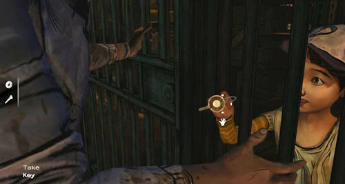 Again, first look at the Gap in the door. You can also look at the Blowtorch behind the bars and the Shelves. Do not try to open the Cage Door - you won't succeed. Instead, boost Clementine so that she can look through the gap. Get ready for some action.