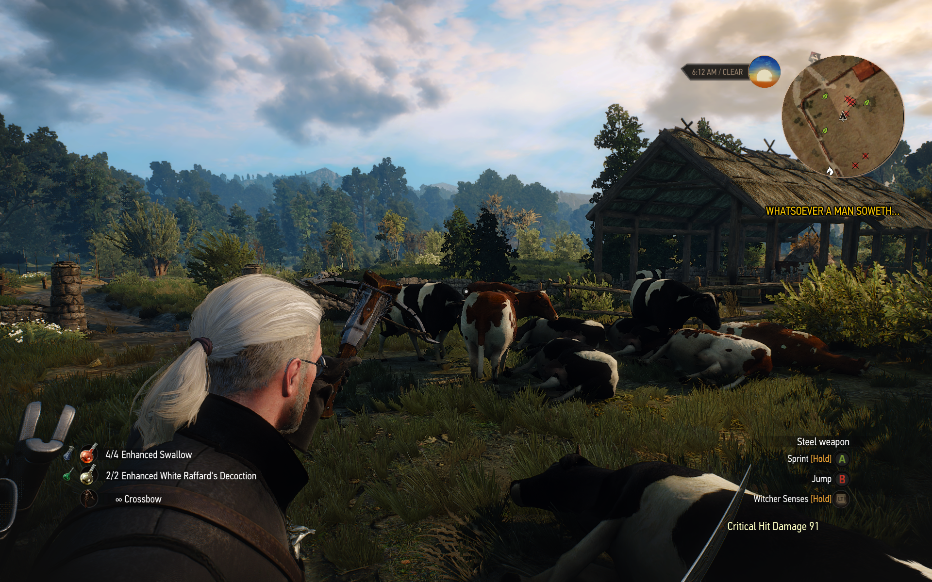 If you don't want to chase the cows that are escaping, you can help yourself with the crossbow. The creatures will fall after a single shot.