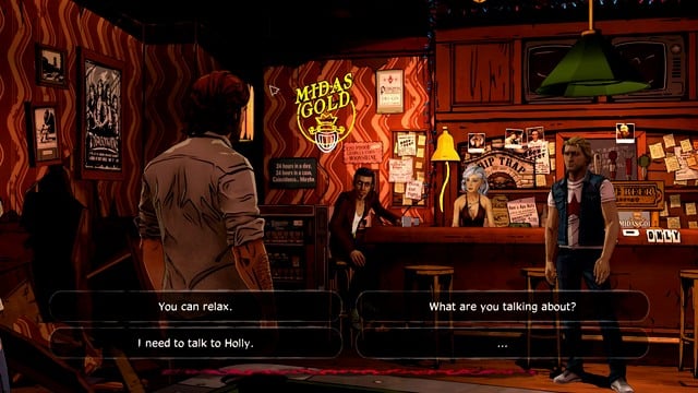 Enter the Trip Trap bar to find Holly. A short exchange with the people in the bar.