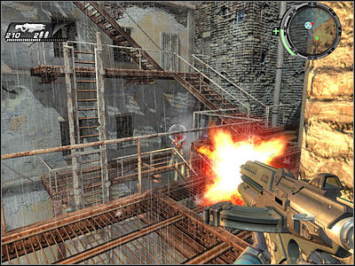 A much larger explosion should take place here. After that, you will probably notice some enemy soldiers. I'd strongly recommend using a zoom feature here for better aim. Make sure that you don't expose yourself too much, so you won't lose a lot of health points. You may also return to the previous room for more ammunition to your machine gun.