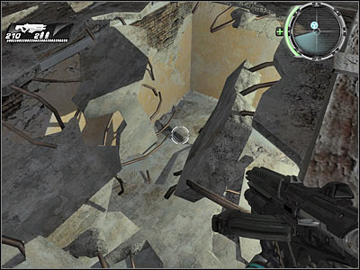 Keep moving straight. You should be getting closer to a destroyed wall. There are two groups of enemy units in front of you. It would be wise to kill them from here. This time you should listen to the advice from the tutorial window. Use the grenade launcher from your machine gun by pressing the right mouse button. Make sure that you've killed both groups before proceeding any further!