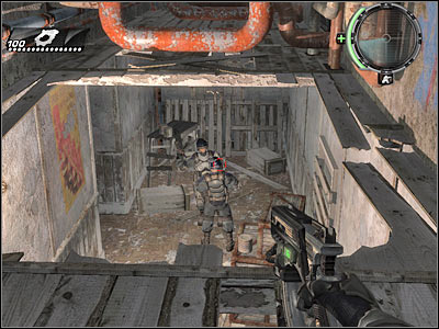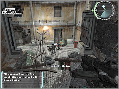 Once again, you will be able to exit the building. There's a single enemy soldier here and it's up to you to get rid of him. I'm sure that you won't have any major problems doing that, especially since you have a lot of ammunition for your two weapons. The second soldier will be standing to your right, on a small balcony (screen). You will have to kill him as well. Use the zoom feature for a better view of the surroundings.