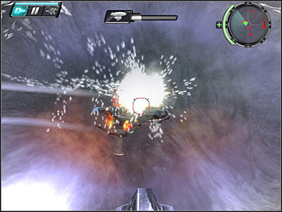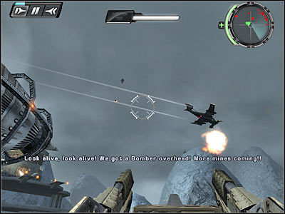 The first phase of this mission will only require you to destroy mines in order to assure a safe route to your next destination. You shouldn't have any problems spotting the mines. It would also be a good idea to use a slow-motion feature from time to time, especially if you have to destroy a larger group of mines. Keep looking around in order to destroy all of these objects, however you should know that the white bar (representing 'health' of the zeppelin) will replenish itself after a short while. You will have to wait for the game to grant you with a new task.
