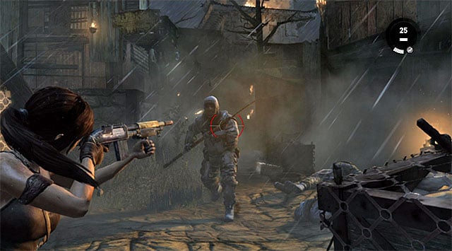 When you step into the next area, wait until the searchlight goes away and place yourself as seen on the above screenshot. A single shot from the grenade launcher should get rid of the machine gun operator (reward: 100 XP). You can now approach and slide down the zip-line (reward: 100 XP).