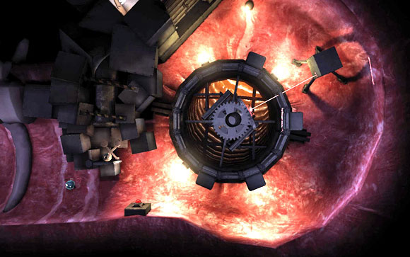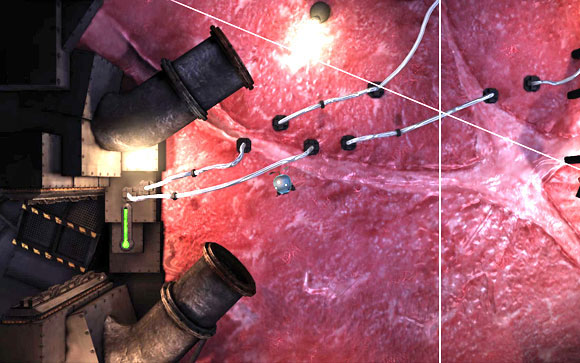 Move further. Fly up from the tunnel. You should find yourself in some kind of guts. Ultimately you should reach the next puzzle [#5] with revolving laser. The piston releases the bomb. Your task is to get the bomb and reach the gate with nearby organ. You have to damage it. Watch out for the laser, because if it touches the bomb, the bomb will explode. If you fail to get there in one attempt, you should consider hiding behind the metal box in the right upper corner (at two o'clock more or less). Try to fly with them bomb in a moment when laser passes you by.