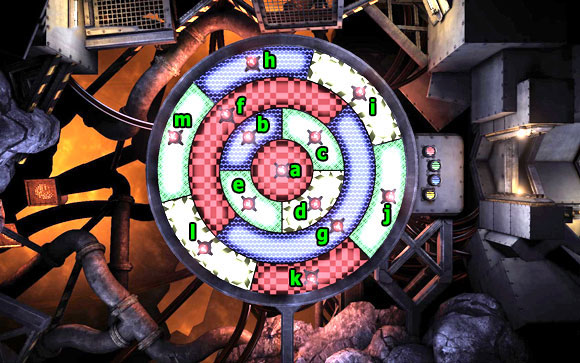 The next puzzle has three phases and it depends on your skill a little [#6]. First take a bomb and throw it to one of channels marked on the above screen. Once the bomb start to fall quickly cut the laser beam so the bomb can reach the next tunnel. You have to determine correct height - it can't be done too low!