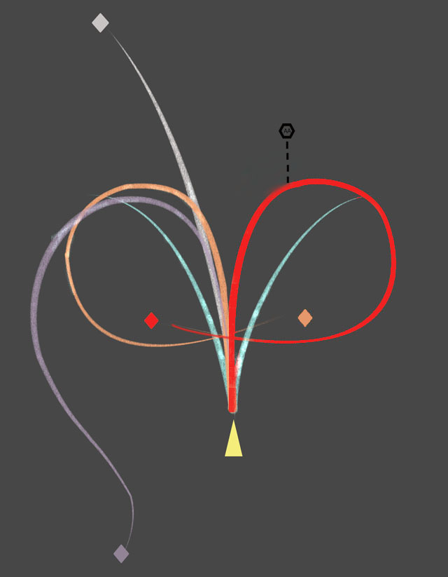 The schematics above shows how the plane moves while turning. Its reaction depends on the maximum angle of turning (blue lines above). If you won't to not fly into anti-flight cannons (black hexagon), click on the left side of a plane (red rhombus). Plane can't take such narrow turns, so it makes a circle (red line) almost over the anti-flight position. When you know how the plane behaves, you can make something similar by clicking on the right side of the plane (orange rhombus and orange line) but it's highly unintuitive. And if you click on left far in front of the plane, it'll fly deep into enemy's territory (grey line), what may be dangerous. The good move is to click on left side, behind a plane and then the turning angle will be proper and he'll turn into desired direction (violet rhombus and line).