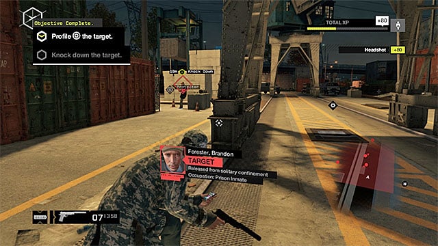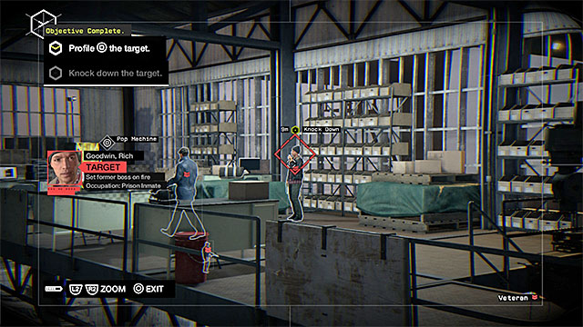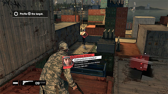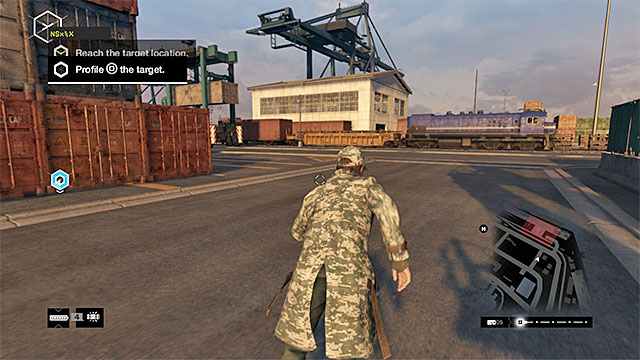 After you approach the red zone, activate the Profiler and start hacking into the nearby cameras. First of all, try to hack into the camera inside the warehouse and to check out its upper balconies. This will allow you to locate the target shown in the above screenshot. The warehouse itself can be approached from any side, by distracting, walking around or killing the enemies that you encounter. Try not to drive the target away, because he would then dart away and you will have to catch up with him.