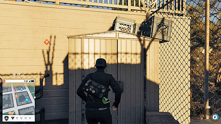The third graffiti (point 11 on our map) needs to be painted in the main part of the city, on the wall of a building located south of the Ghirardelli Square and east of the Lombard Street. Go around the building and find a lift near one of the blue walls, which you can bring down thanks to hacking. Enter the lift with Marcus and hack the lift again to reach the top of the building.