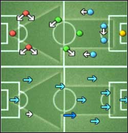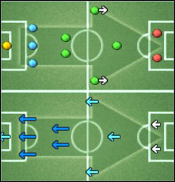 ![]() | Situation almost similar to previous, but on the other side of the pitch. With moving the formation "blues" are presenting "reds" in the way: positional attack. |