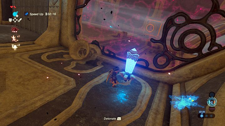 Fly over to the other wing and hit the crystal. Enter the balcony and jump down - allow the wind to carry you to the elevated part with the terminal. Tilt the deck to the other side and throw a bomb into the hap. Detonate it to destroy the stone blockade. Throw one more bomb and hit the crystal. The wind will move it towards the wall. Detonate the second bomb. Tilt everything to make the ball get out of the room, use the Magnesis Rune to get it on the other side and tilt the deck once again to make it hit the glowing marker. You will gain access to the terminal. Go to the very top and fight the boss.