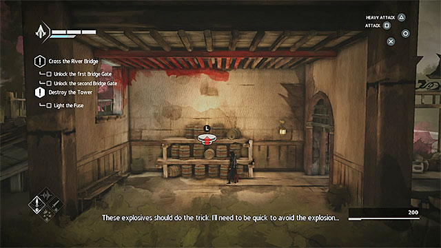 For now, two closed gates block the passage through the bridge. This can be solved by destroying the tower on the left. Walk towards the tower and unlock the entrance to it with a spinning-wheel. To destroy the tower you must light the fuse near barrels placed on the lowest level of the construction. It will activate a time limit - you will have 50 seconds to run from the tower. It will be possible only by reaching the top of it (door on the right will close).