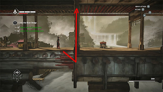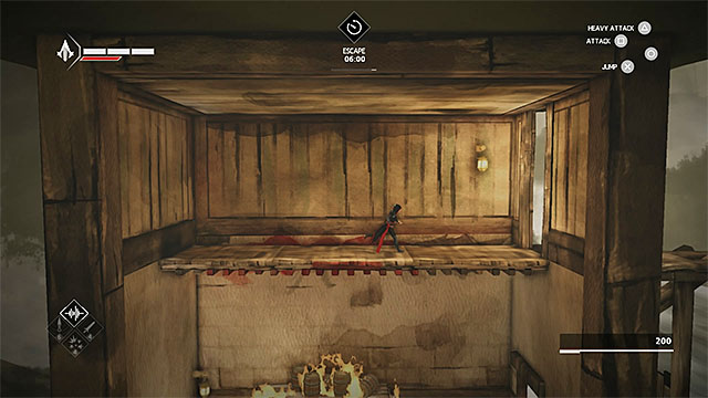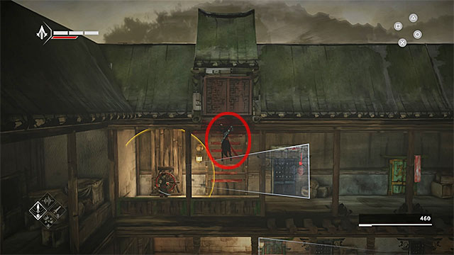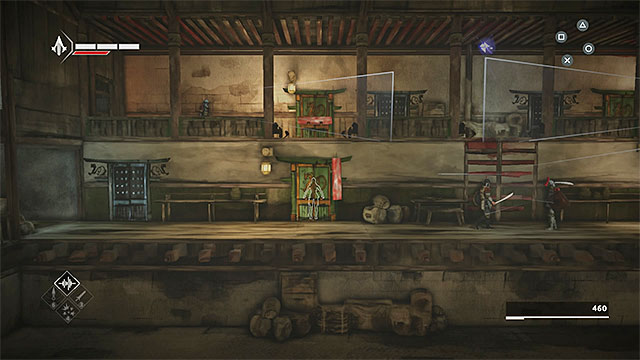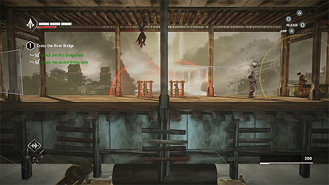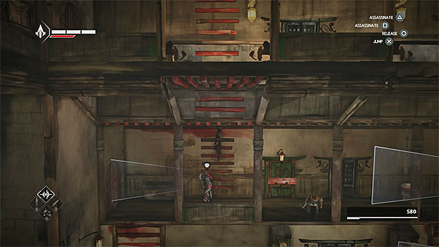 Lower yourself down at the spot where there is a red ladder leading to the lower floor. Wait until guard with a spear shows under the ladder and press the attack button. You will jump on him. Now go right and attack the enemy with a crossbow who is constantly looking down. Another guard is patrolling the right side of this floor - wait for him to go to the right and quickly get close to him.