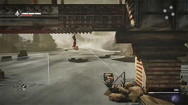 Return near the dog cages. Start lowering yourself until you get under the bridge. When you reach the place shown on the picture above, use throwing knife to cut the line. A boat tied to it will change its position. Land on it, then jump to the edges on the right. Go right, collect Helix Boost on your way. Jump to the post sticking from the water and then to the right ledge.
