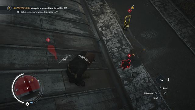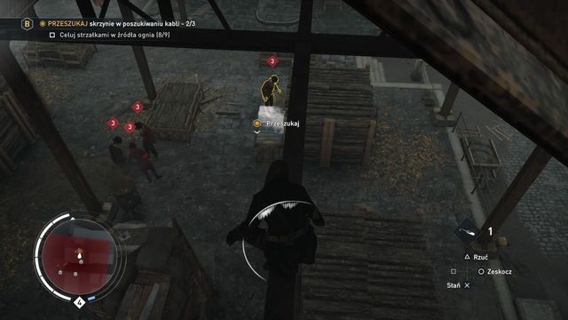 The second chest is guarded by a single opponent who you can kill in any way you want (for example, by jumping on him from above). Search it and jump on the roof from which you can shoot the barrel with fire - do it when two enemies will be standing near it. Then, use the rope to get to the next roof.