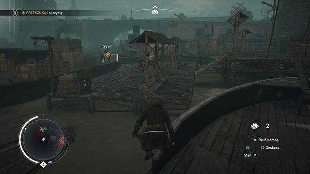 Once you notice the swimming ferry, quickly run towards it. Don't jump into the water, it will be harder to catch it that way - instead, jump from one ship to another, they are placed in such way so that it will be easier for you to catch the ferry. You can jump on the deck from the last ship, once you're close to the bridge. If you will fail, run through the boats near the ferry which will stop not far behind the bridge. Now use the distraction to kill the remaining opponents and open the chest (you can do it before the ferry stops). Now you must return to Bell.