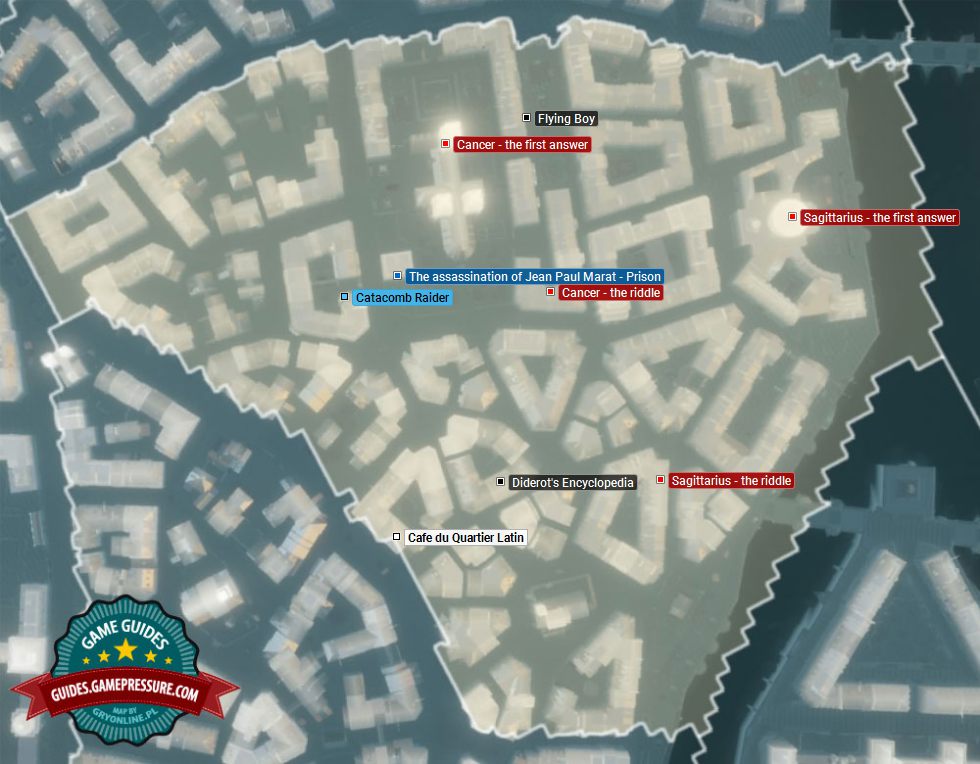 The second solution is in Sorbonne. Climb onto the side tower, onto the balcony below the roof. The symbol is on the wall. To locate the third solution, see the map in Luxembourg -> Paris stories.