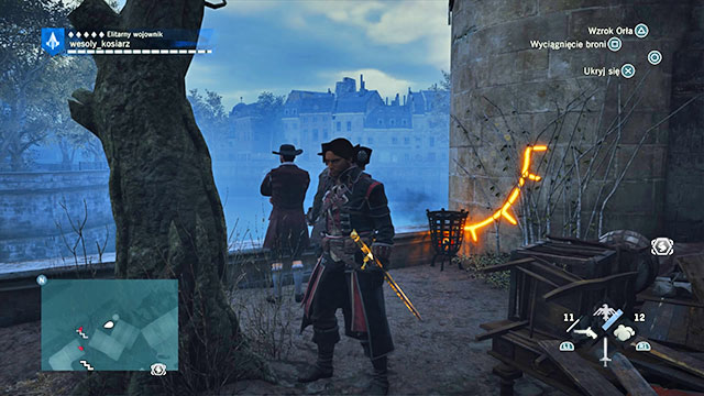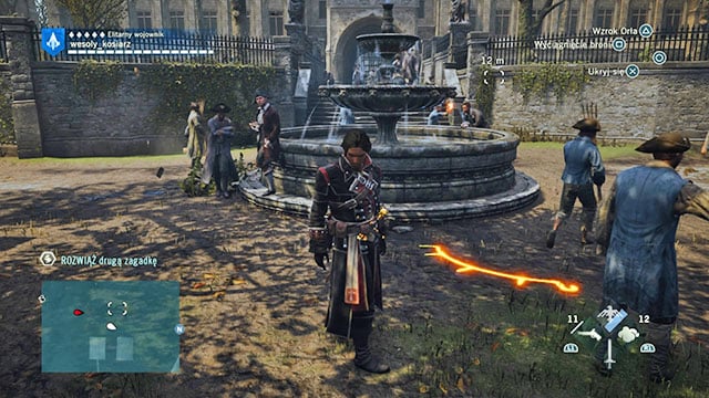After you free the three assassins, return to the location, where you have obtained the register. Between the houses, there appears Roux with guards. Let him spot you and Roux starts to run. Toss a smoke bomb to scatter the guards and follow Roux. Then shoot him. One bullet should do. If not, try again. After the assassination, leave the area and become anonymous.