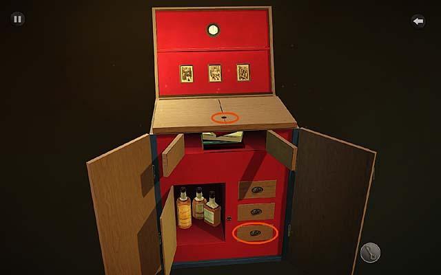 Then click on the knob (on the frontal side of the trunk) and turn it to horizontal position. Open little doors on the top, you will find a pile of books (including the one about black dragon). Zoom in, click the latch, open the door. There are three bottles with drinks. Open the drawers on the right, in the bottom one you will find an Allen key.