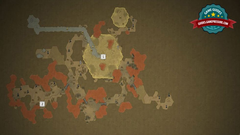 In the underground, the most important spot is Gorsmog's Throne City [1]. After you capture it, you should go to the South-West, where there is a teleporter that transports you to the surface, right next to Voraditius main city [2].