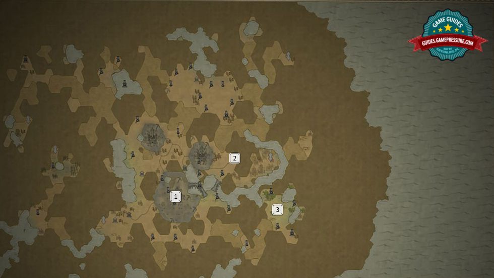 In the Underground, arguably the most important spot is the Throne City [1] and the surrounding cities. It is a good idea to start one of your own, across the river [2]. After you have dealt with everything here, take the exit [3].