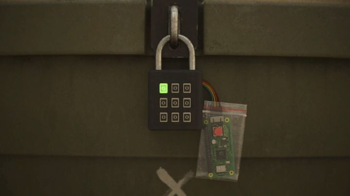 - After interacting with the box, examine the container's padlock.