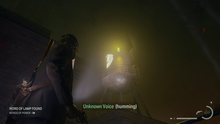 The next collectible is located a few steps further. Climb the ladder located to the left of the save room. Once you get to the upper floor of the roof, point your flashlight at the water tank nearby. The Word of Power is painted on it.