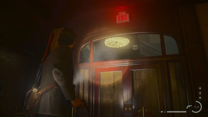 Head towards the central part of the 2nd floor of the hotel. Looking at the staircase from the south, through one of the windows you will see the Word of Power painted on the ceiling. Its activation may require some maneuvering in search of the proper angle of the flashlight's light.