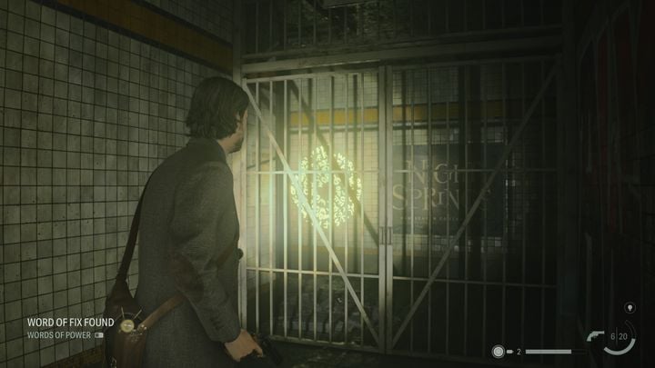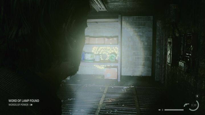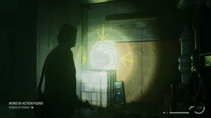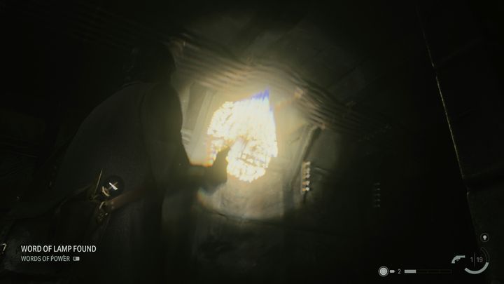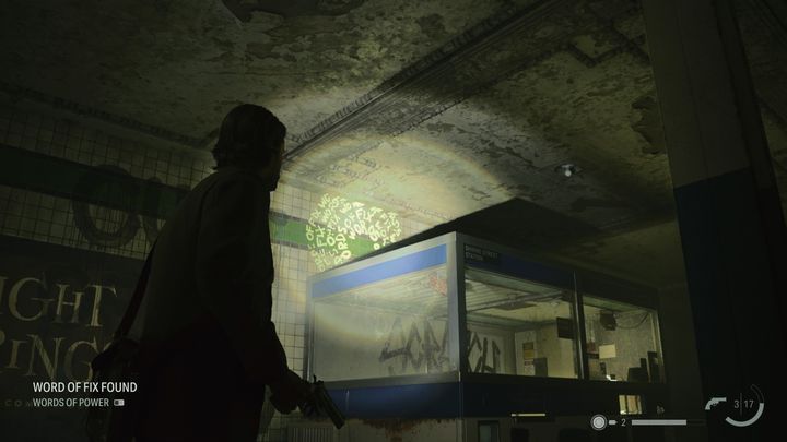 The first Word of Power can be found right after Casey dies, shortly after escaping from the TV studio. After taking the revolver and flashlight from the dead man, use the lamp to absorb the light from the alley. You will see a passage through which you can get to the building. Yellow glowing arrows will show you the way. The Word of Power is located above the door frame at the end of the hall.