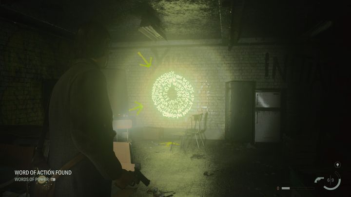 Upon reaching the room with a ladder in the southern part of the map, head to the alley, where you will be guided by the yellow arrows. The Word of Power is hidden behind the board, which you can destroy with your revolver.