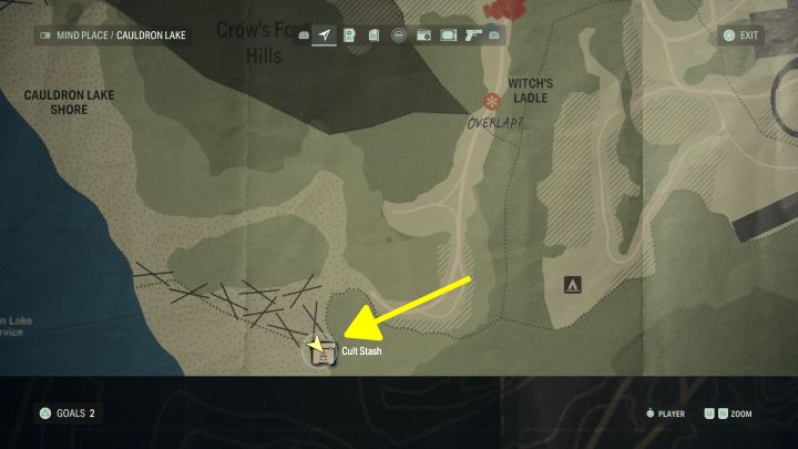 - Investigate the small building by the water marked in picture 2. There you will find a cult stash - open it with combination 697 and take the collectible.