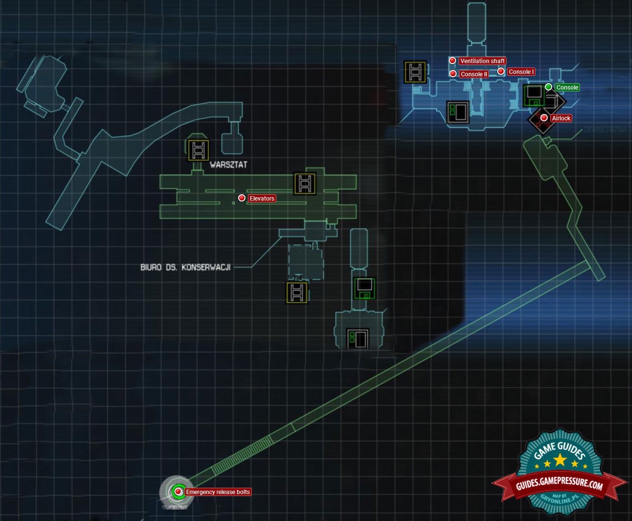 Exit the elevator and use the save game station on the left. In the next room, you will find a map update console. Leave the room and follow the corridor to the next room, and the objective will be updated.