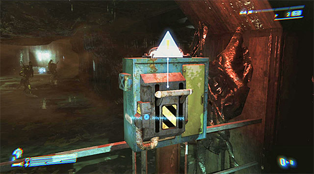 Soon after going through another checkpoint you'll find yourself in the section occupied by new dormant aliens. Theoretically, you could try and walk past them, keeping an eye on them all the time, but it's better to just get rid of them for good. To do it, move forward, but get on the small balcony on the right the first chance you have. Pull the lever (the above screenshot) to power up a nearby pump. As a result, each Xenomorph will run towards it and explode on contact with it.