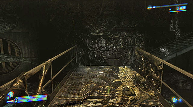 Carefully, make your way ahead, stopping every time you detect any activity from the aliens. Take the ramp to the metal platform. You have to options now: continue walking along the upper platform (screenshot 1) or wait for the left door to open and enter the side room (screenshot 2). In both cases make sure not to accelerate even after moving away from the Xenos, because you can still alert them to your presence.