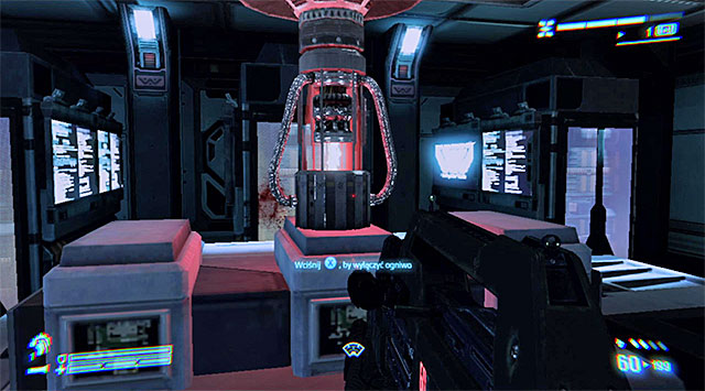As for the cells, you can locate them with the motion tracker. Two of them are easily reachable; you only need open the interactive door and shoot a single enemy (screenshot 1). Interact with the cells to disable them (screenshot 2).