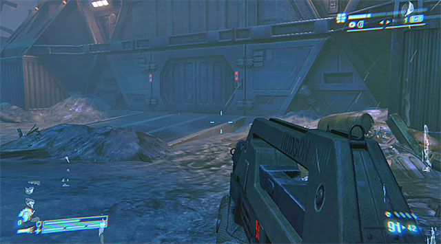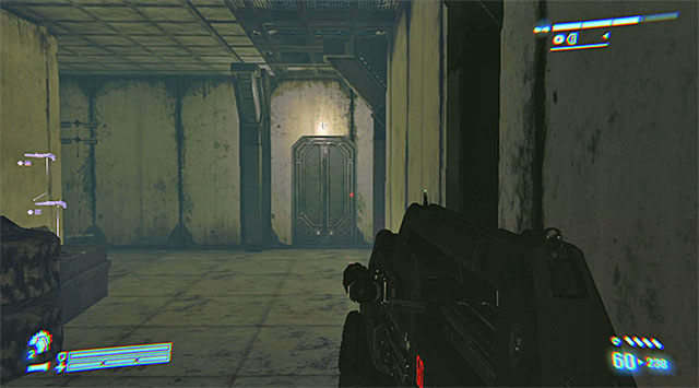 Go inside and start exploring the narrow corridors; you won't come across any aliens for now. When you get to the closed door, use the welding torch the only way you know how to get through to a huge garage.