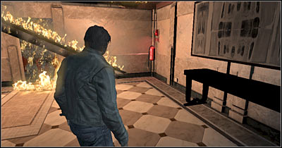 You'll end up standing inside a room with a blocked exit. You should also notice that fire has spread itself to this area of the building. Dealing with this problem should be considered a top priority. There's a fire extinguisher in the corner of the room (screen). Take this item and turn left, so you'll be facing the flames.