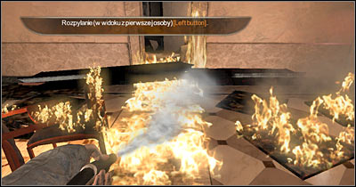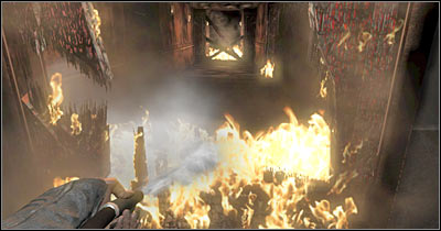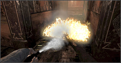 Despite what you might have heard from your new allies, you won't have to be in a lot of hurry. Keep moving slowly and watch out for additional explosions. Focus only on putting out the fire and prevent the flames from reappearing behind you. Once you've reached a junction, turn right and keep using the fire extinguisher (screen). You will have to secure this entire corridor. It shouldn't be a major problem.