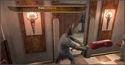 Once you've taken care of the flames, you may finally proceed to a new room. You'll encounter one of the civilians here. As you've probably suspected, your next task will be to smash the door to his room, allowing him to escape. Don't throw away your fire extinguisher just yet. Instead, switch to TPP view and start smashing the door with this object (screen). You can change the position of the extinguisher in your hands by using your mouse. I would recommend aiming for the lock, because there's a high probability of destroying the door quickly. Once this is done, go back with your new ally to the main corridor.
