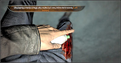 Head on to the nearest room and read a new hint. You'll learn how to heal your wounds. Now you should focus on exploring your surroundings. Remember that you can open most of the cupboards and lockers by pressing the action key. You should gain possession of a few batteries, a medical spray and a duct tape. Press the H key and you'll be presented with areas of your body which you'll need to heal (screen). Use the spray to heal your wounds. Close this window once you're back in full health.