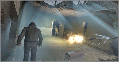 Make sure that the area has been secured. Throw away the fire extinguisher, because you won't need it anymore. You can do this by pressing the Q key. Notice a large hole in the ground (screen). Move back, start running and perform a jump by pressing the SPACE key. This will allow you to reach a new corridor safely. Press ALT and see what happened to your allies.