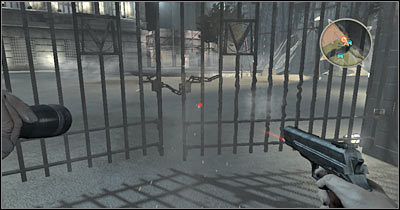 Exit the vehicle, because you wouldn't be able to use it to smash the main gate of the museum. There are some interesting items to your left, including explosive bottles. Make sure that you've taken at least one bottle. Choose a pistol from your inventory and head over to the main gate. Use the pistol to destroy a new padlock (screen) and enter museum grounds carefully.