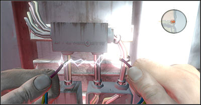 Just as before, your task will be to bring two cables closer. Choose violet cables (screen). You'll also have to wait a little longer before you'll notice that what you're doing has an effect. A nearby elevator is now active and you should go there now. Listen to a short conversation in the meantime. Find a panel and press the first button to go up.