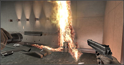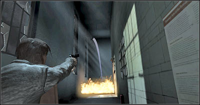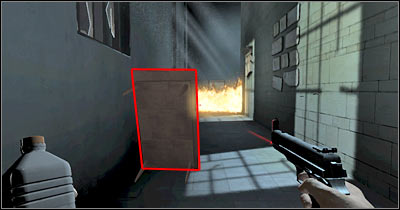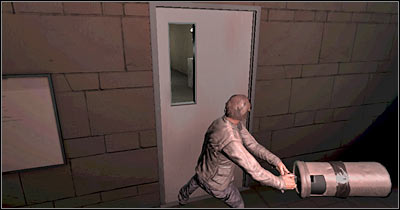 Keep repeating these actions until you've killed at least one monster. Use the fire extinguisher to put out the flames and deal with the second monster. Once this is done, proceed to a new corridor. Thankfully, you won't encounter any other monsters along the way. Eventually you'll come across a closed door. Pick up a larger object and use it to destroy this door (screen). You could also try blowing the door up, however it won't be necessary. Either way, you will have to find your way inside. Keep heading forward until you've reached a much larger area. This is where the fourth chapter of the game will come to an end.